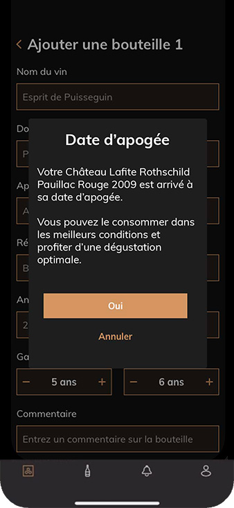 Dégustez vos vins dans les meilleures conditions grâce à l’alerte date d’apogée. Vous recevez une alerte lorsque vos vins sont arrivés à leur date d’apogée.