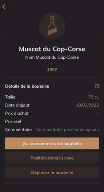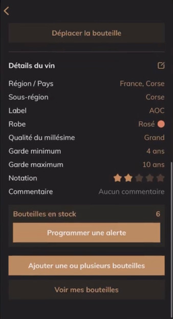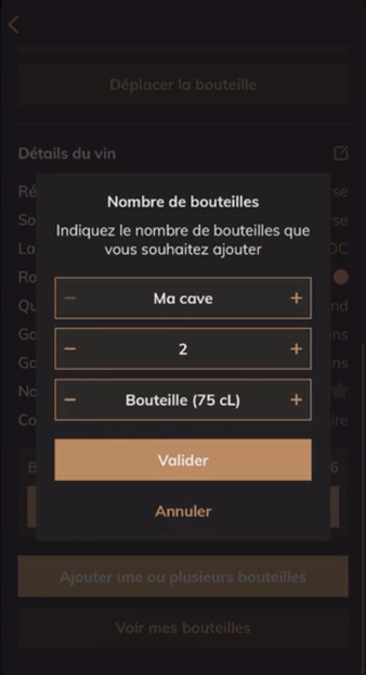 Pour retrouver la bouteille en question, appuyez sur « afficher dans ma cave » pour qu’un témoin lumineux s’allume dans votre cave physique et vous indique son emplacement exact.